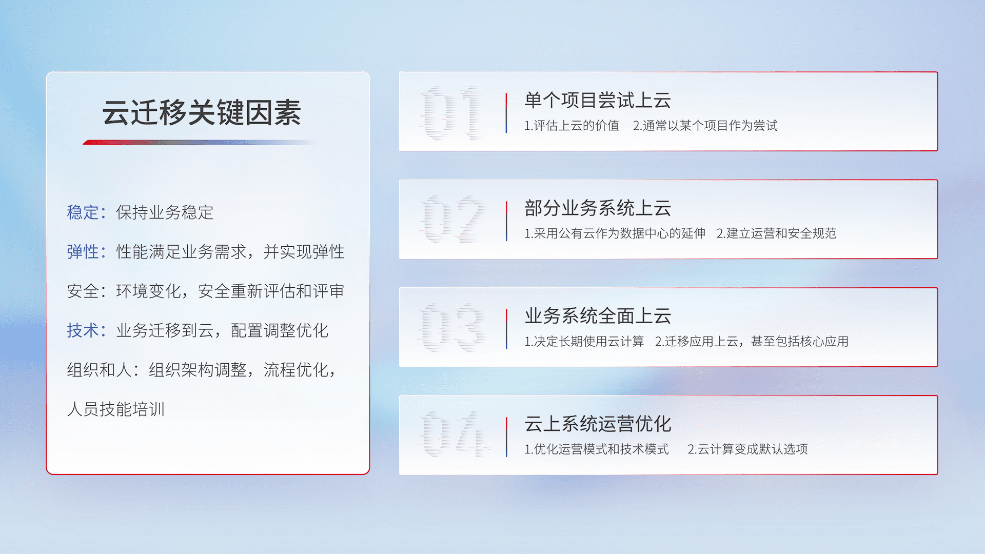 结合实际业务,,,从规划设计、、、、云平台选型、、、、云原生改造、、数据迁移、、、、集成交付,,,,迁移全过程为客户识别最佳上云路径,,,做好风险识别管理,,,设计网络架构、、身份权限、、安全审计合规、、、操作审计、、、日志审计、、监控告警策略、、、、多站点容灾设计等,,,,对云上基础设施进行整体规划,,,,提升IT治理水平,,,,以满足弹性、、、高可用、、高性能的需求。。。。