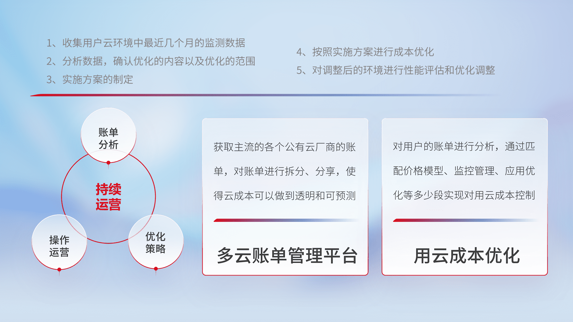 通过多云纳管,,,以统一的资源数据模型把客户的云资源进行抽象和封装,,,进而实现对多云资源的统一操作,,保障云资源管理的可靠性、、稳定性与可用性。。量身定制化运维内容,,,配置、、、开发运维、、、、补丁管理、、、备份、、、、监控、、、认证和访问管理、、、、审计和日常巡检等,,,保障在用云过程中的可靠度,,,稳定度以及高可用率。。